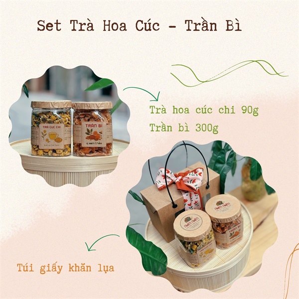 Set quà tặng kết hợp vị dịu nhẹ của trà hoa cúc chi 90g cùng chút cay the ngọt hậu của trần bì 300g, mang đến thức uống thư giãn, hỗ trợ tiêu hoá và làm ấm cơ thể.